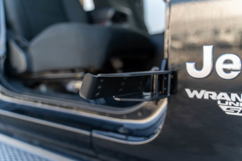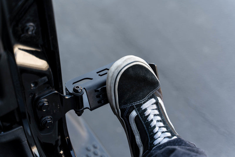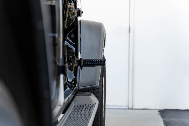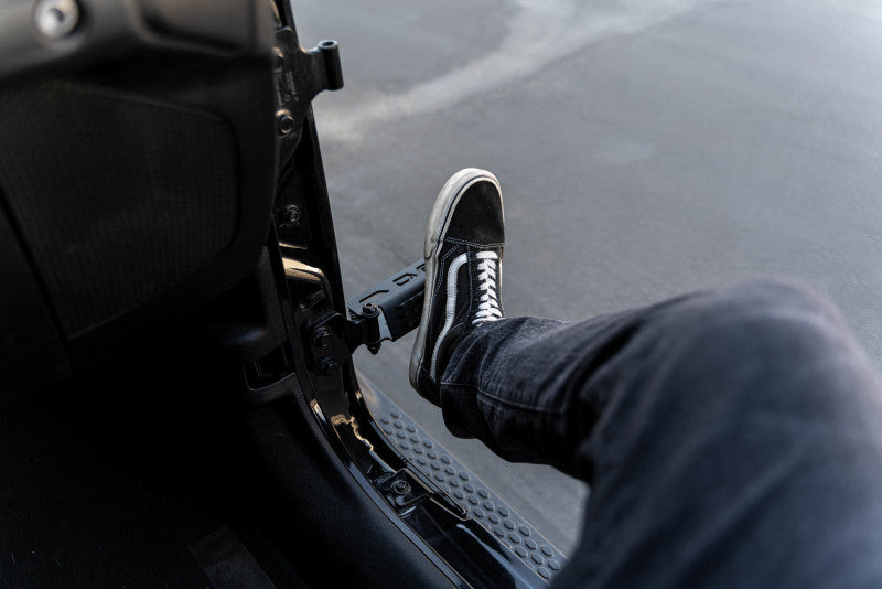 Our new and improved Foot Pegs were designed for the Wrangler (JK/JL) & Gladiator to enhance your open-air experience while your doors are off. They provide a place for you and your passengers to rest your foot. The pegs are hinged so you can close them when not in use, and feature a padded stopper to reduce metal on metal contact. A rugged anti-slip pedal design keeps your foot in place. Our pegs come as a pair, fit both front and rear hinges, and feature a quick and easy install.