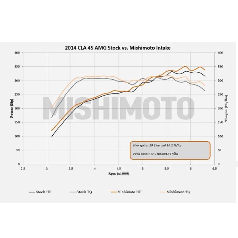 Mishimoto has developed a performance air intake engineered specifically for the 2014-2019 Mercedes CLA45 AMG! The intake features numerous innovative components, including a silicone turbo inlet hose that contains a co-molded CNC block for the stock sensors and breather ports! The silicone inlet hose was designed with smooth contours and transitions for maximum airflow compared to the stock rubber hose. The combination of this silicone inlet hose and our free-flowing Mishimoto air filter translated to massive gains of 20 whp and 17 wtq at 5900RPM! This intake is safe to use with the stock tune as it will not hurt air/fuel ratios under load. This intake has a unique and aggressive tone under acceleration and boost, and the free-flowing design amplifies turbocharger spool and BPV sounds. Check out the video to hear the tone. The stock intake duct is utilized to provide cool airflow to the Mishimoto High-Flow Oiled Air Filter, which features increased filtration surface area compared to the stock paper filter. This filter can be cleaned and reused, providing a lifetime of service. The intake includes an enclosed airbox that collects all of the cold outside air from the front of the engine. The airbox is made from 5052 aluminum with a black powder-coated finish to reduce weight compared to a steel intake box, and to prevent against any corrosion. The airbox also protects against engine bay heat-soak, and it provides a stock-like engine bay appearance. This unit is a complete bolt-on that functions perfectly with the stock tune and can be installed in one hour using common hand tools. This kit includes the Mishimoto Lifetime Warranty, ensuring superior product quality and craftsmanship.in