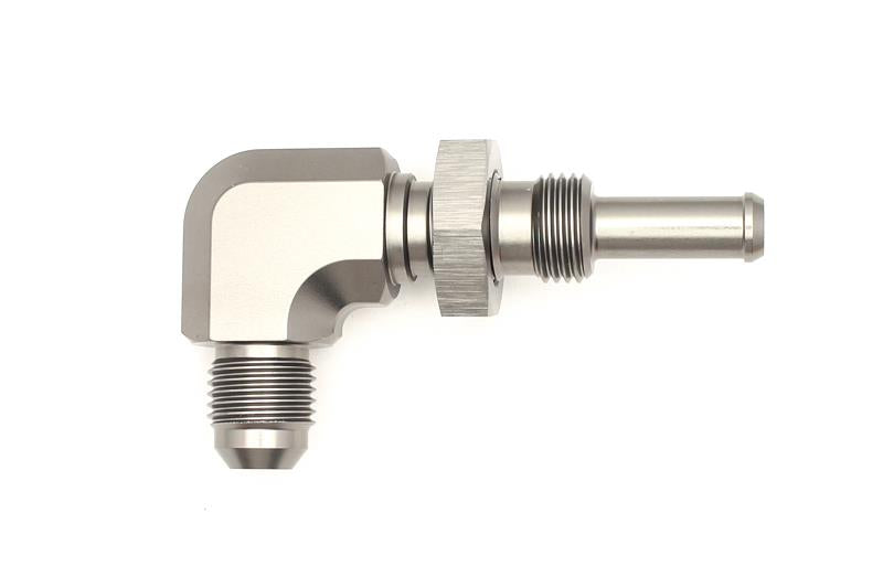 DeatschWerks 6AN Male Flare To 5/16in. Male Barb Bulkhead Adapter 90-Degree (Incl. Nut)