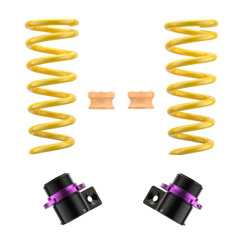 KW (H.A.S) Height Adjustable Spring kits are a great alternative to conventional lowering springs. You are no longer stuck with a fixed lowering height. KW H.A.S. systems allow you to adjust the vehicle ride height with the KW height adjuster even after the kit has been installed. Your vehicle not only gets a more dynamic look, but also the steering behavior and response of the standard dampers becomes more agile. All driver assistance systems and comfort features of a factory adaptive or electronic suspension remain operational and work harmoniously with our vehicle specific spring set up. KW uses high-quality springs made of chrome-silicon steel with spring rates designed specifically for each respective OE suspension damper and wheel load. KW's expertise and engineering ensure the spring rates will pair perfectly with the different damper characteristics of your factory adaptive electronic suspension. Along with the use of high quality materials and the included KW ride height Adjustment - mechanisms, our KW H.A.S. kits always includes the vehicle-specific bump stops with dust protection system to protect your factory suspension against wear & tear caused by road grime and debris. Similar to a coilover suspension, the KW H.A.S kit allow a continuous adjustable ride height within a tested range, something not possible with conventional lowering springs. The dust protection elements and spring perches included in the delivery, when applicable, are always adjusted to the maximum technically possible lowering, typically limited by the factory dampers. With KW height adjustable springs, a sporty and harmonious driving behavior can be achieved without the driving dynamics of performance-oriented vehicles suffering. As with all KW suspension products our engineers develop vehicle specific parameters and spring specifications which undergo comprehensive testing on the Nurburgring Nordschleife and in our KW 7-post Driving Dynamic Test Center.
