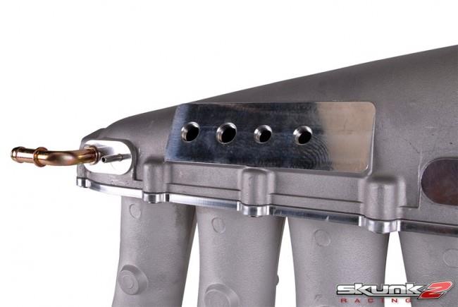 The engineers at Skunk2 Racing have worked tirelessly to develop the next generation of high performance intake manifolds and are proud to announce the release of the much anticipated Ultra Series Intake Manifold. Years of R&D have culminated in a multi-piece cast aluminum intake manifold that offers advantages that only a modular design could allow. Building upon the performance legacy of our Pro Series Intake Manifold, as well as using the latest in CFD (Computational Fluid Dynamics) software; Skunk2 Racing has created a three-piece modular design that allows for easy disassembly, porting, and plenum volume changes through the use of a removable plenum and optional plenum spacers. In addition to CFD testing, the Ultra Series Intake Manifold has undergone extensive in-house dyno and on-car testing which has led to a design that is less restrictive, yielding both torque and power gains well over many of the competitors. Detailed and meticulous planning went into every aspect of the Ultra Series Street Intake Manifold. Ultra Series Street Intake Manifolds are manufactured from cast-aluminum high-grade 356 aluminum alloy for lightweight yet added strength over sheet metal manifolds. Each manifold is CNC-machined for a precise fit, and individually inspected for quality assurance. The Ultra Series Street manifold features a generous 74mm throttle body opening and is constructed with thick walls and entry minimizing concerns of breakthrough when port matching. Intense planning and design went into the plenum (1.82L plenum volume) to distribute even airflow to all four cylinders under dynamic load conditions. Placement and design of the velocity stacks were rigorously flow tested to ensure maximum delivery of air to the cylinder. Large velocity stack raised bell mouth entries lead to long 221.5mm intake runners with smooth transitions allowing the Ultra Series Street Intake Manifold to outflow the competition.
